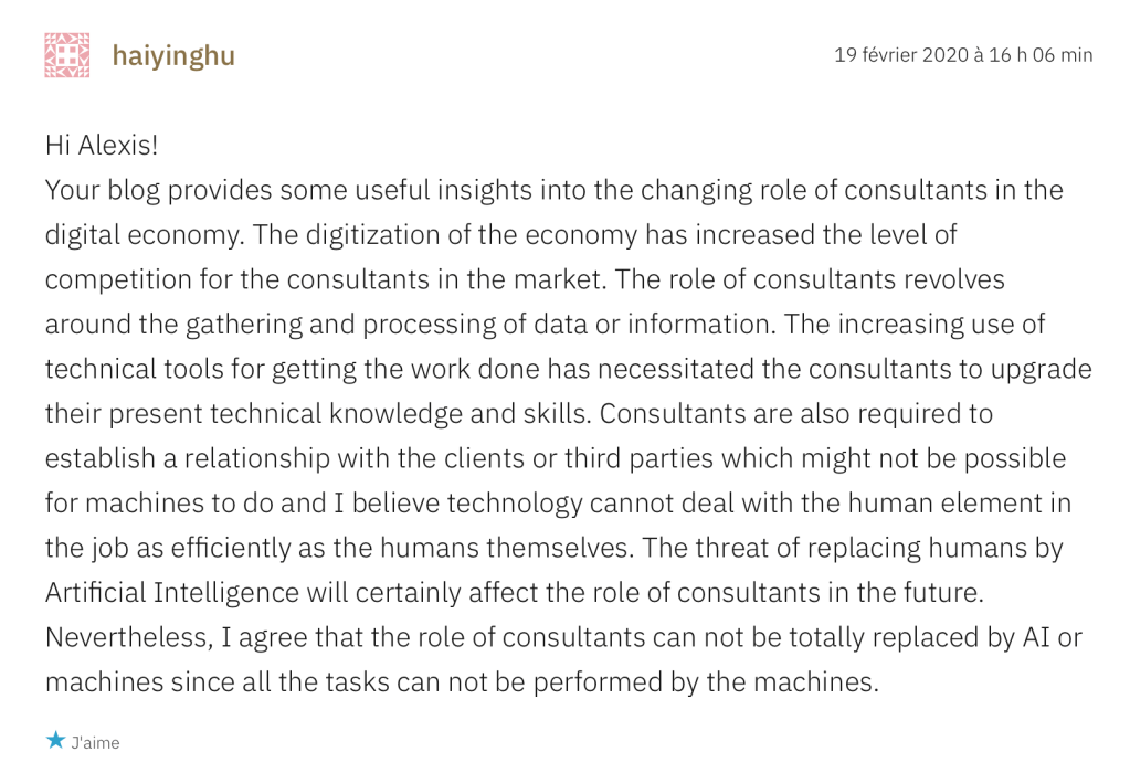 Reading and commenting on the blogs of other learners constitute numerous advantages for any learner. Blogs have been increasingly becoming a great platform for obtaining any information and discussing it (Walker, 2007). Over the course of this module, we had been provided with multiple opportunities to learn from writing blogs, reading relevant information and posting valuable comments on the posts of other learners. Through the blog post on the changing role of a specific job in the digital economy, I got to learn about different interest areas of colleagues with regard to their views on the impact of digitization on various career opportunities and job roles. Reading the posts of other learners helped me in enhancing my existing knowledge of specific job roles and ideas through which I could improve upon my own blogs. For instance, I learned that long paragraphs in blog writing can be uninteresting for the readers and using more pictures, graphs, charts, etc. engages the readers. Commenting about valuable insights relevant to the blog of others helps in establishing a connection between all the fellow learners, be it within the university or the entire MOOC community. Posting valuable comments depict the engagement of the readers in the content of the blog and enhance the probability of them to read another blog of ours.